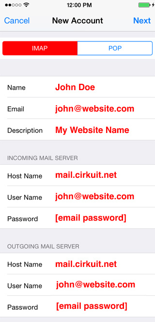 7) Several of the settings entered on the previous screen should automatically be filled out on this screen. Select the IMAP option at the top and scroll down to the Incoming Mail Server and Outgoing Mail Server settings. Enter the following information and tap Next.